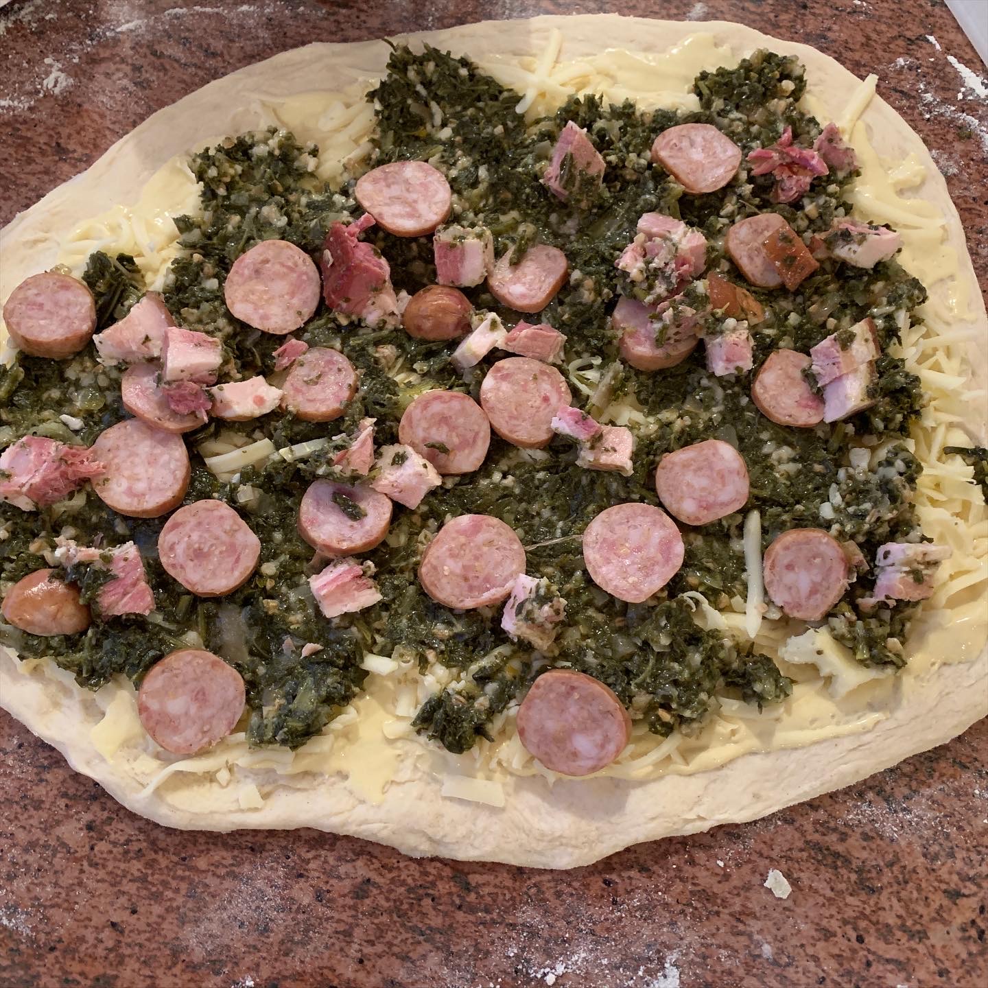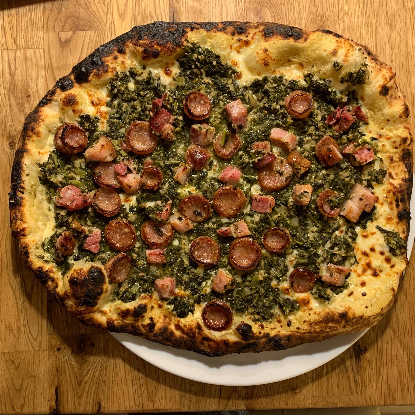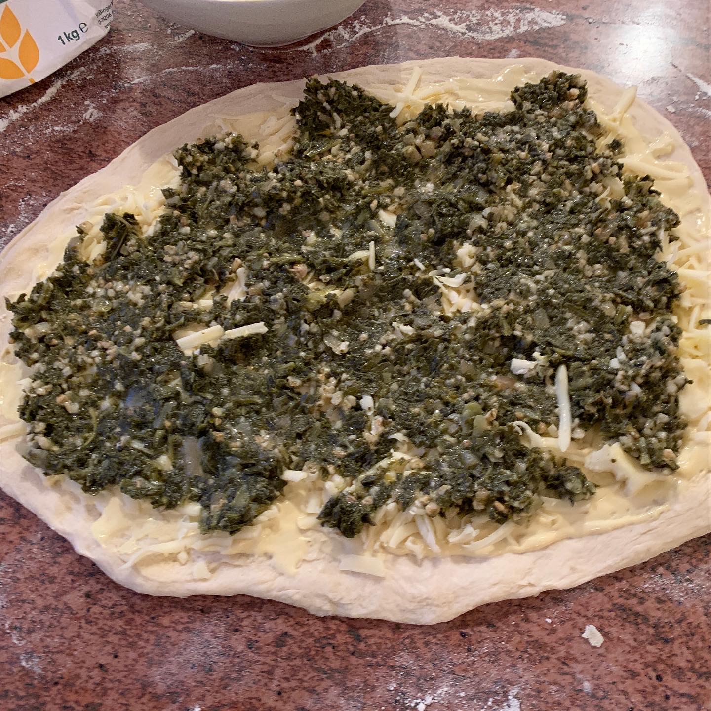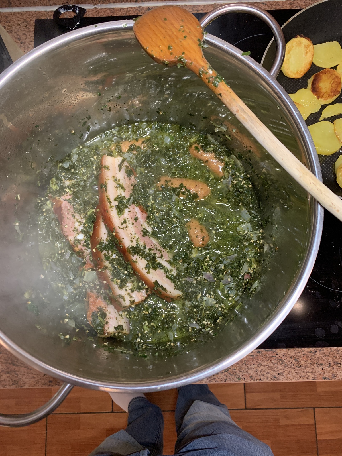 Dann hat Holger den Grünkohl nach Ammerländer Art vorgestellt, den er nach diesem Rezept (Link zu Chefkoch.de) zubereitet hat. Aus Resten des Grünkohls hat er dann mit einem Hefeteig eine Grünkohlpizza gemacht.