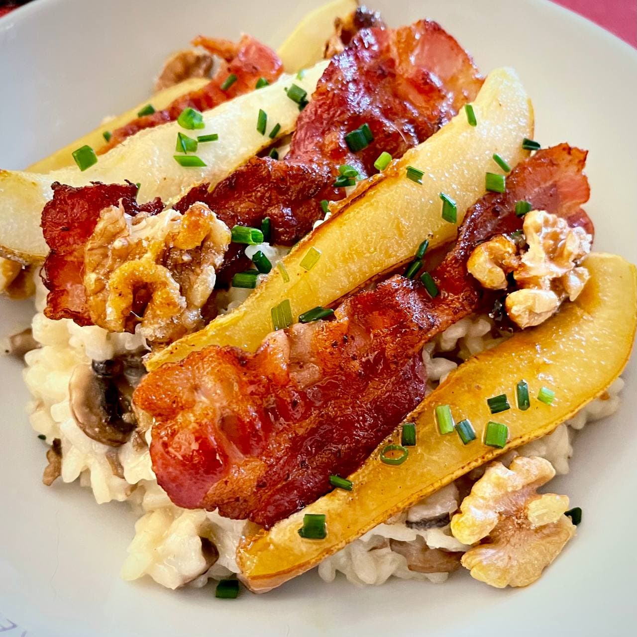 - Den gerieben Parmesan unter das fertige Risotto rühren.Dann das Risotto auf einem angewärmten Teller verteilen. Birnen, Walnüsse undBacon darauf verteilen und zum Abschluss mit Schnittlauch bestreuen.